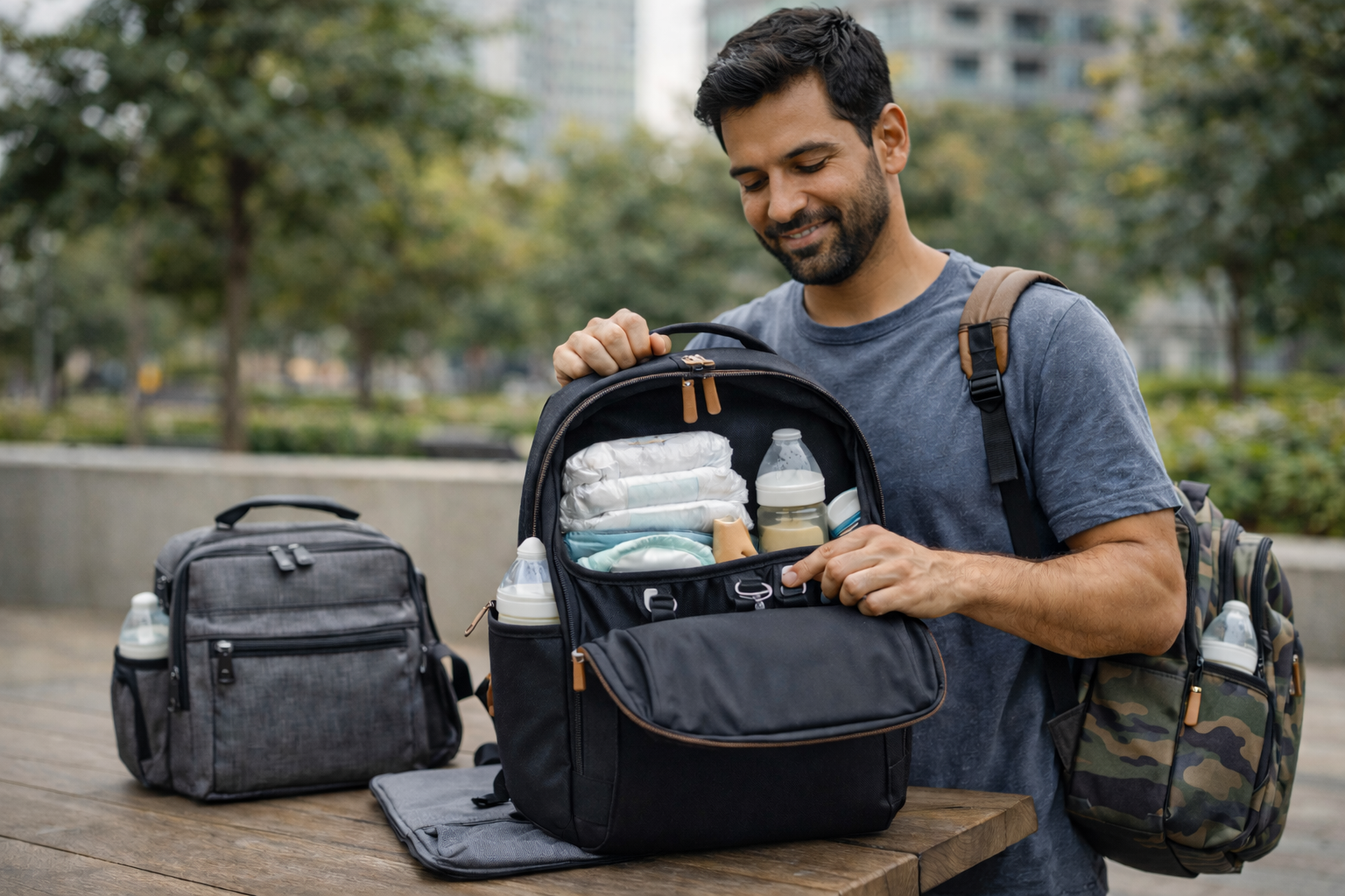 Happy man carrying a diaper bag backpack containing baby essentials in a sunny urban park.
